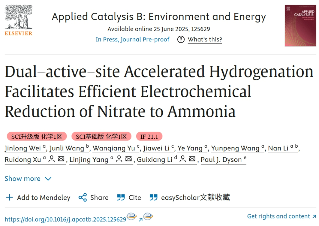 近日,澳门娱乐城官网 有色金属复合结构电级材料团队在电还原硝酸根制氨研究领域取得重要进展,研究成果“Dual-active-siteAcceleratedHydrogenationFacilitatesEfficientElectrochemicalReductionofNitratetoAmmonia”在环境与能源催化领域国际顶级期刊AppliedCatalysisB:EnvironmentandEnergy上发表。澳门娱乐城官网 2022级博士研...