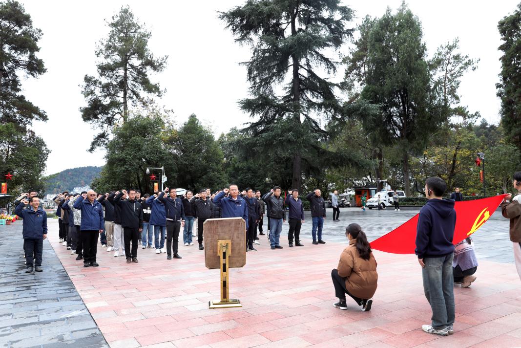 在凤凰山红军烈士陵园,学员代表向红军烈士敬献花篮,全体学员向红军烈士纪念碑行礼以表哀思和敬意,并集体重温入党誓词。