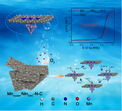 目前,燃料电池汽车的商用催化剂为碳载Pt基催化剂,而Pt资源稀缺、价格昂贵限制了燃料电池汽车的大规模商业化发展。为降低成本、减少对贵金属的依赖,研究人员积极探索非贵金属催化剂的替代方案。在非贵金属催化剂中,铁-氮-碳(Fe-N-C)单原子催化剂因其优异的氧还原反应(ORR)性能、相对低成本和可持续性备受关注。然而,Fe-N-C催化剂在ORR过程中容易发生芬顿反应,产生过氧化氢,腐蚀电极,降低电池寿命。而Mn基催化剂基本不涉及芬顿反应,可大大提高电池寿命。基于此,在研究工作1中,研究团队创新性提出一种“由Mn团簇调控同核Mn双单原子位点Mn2-N6的电子结构来实现高效ORR性能”的策略。其中,同核双单原子Mn2-N6由于存在两个活性位点,吸附氧气时以桥联方式吸附,解决了孤立的单原子活性位点对氧吸附能力不足的问题;同时,Mn团簇的引入,使Mn2-N6的平面结构发生畸变,降低了含氧中间体在活性位点上的吸附强度,使ORR反应能垒降低,打破了反应中间体在孤立活性位点上的吸脱附比例关系极限,从而加速了ORR过程。这种以团簇修饰同核双单原子位点来提升ORR性能的策略,为今后非贵金属单原子催化剂的研究和发展提供了一种新思路。