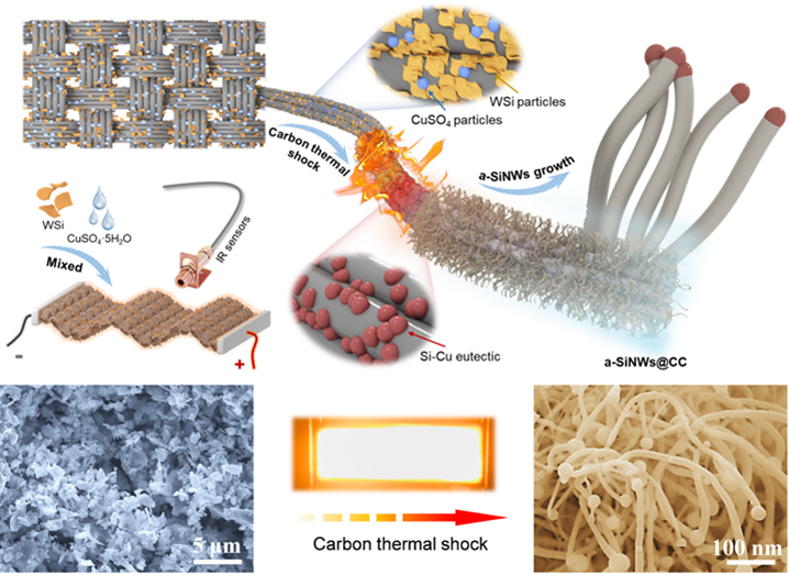 基于光伏切割硅废料特有的禀赋,充分发挥其固有的氧化膜特性,团队利用焦耳热冲击提供的快速生热与淬冷,在大梯度热场下诱导硅原子沿一维方向扩散,引入铜纳米颗粒调节高温下铜硅液滴熔点及表面能,诱导硅晶粒在碳基体上快速成核并原位生长为非晶硅纳米线,将其直接用作锂电负极展示出了优异的储锂性能(初始库伦效率约91.35%,循环200次后容量保持率约95%)。这一高效高值循环再生利用技术为光伏切割硅废料的增值回用提供了新思路,为低成本制备锂电用高性能非晶硅纳米线材料提供了新路径。
