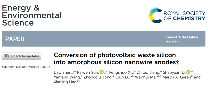 借助光伏硅切割废料粒度细、纯度高、片层结构的独特禀赋,昆明理工大学硅冶金与硅材料团队开展了大量硅切割废料制备锂离子硅基负极方面的研究工作,已经取得了一系列研究进展。近期,昆明理工大学硅冶金与硅材料创新团队(马文会教授、李绍元教授)联合新南威尔士大学郝晓静院士等人提出了一种硅切割废料超快转化合成非晶硅纳米线策略,获得优异的储锂性能。成果以“Conversion of photovoltaic waste silicon into amorphous silicon nanowire anodes”为题发表在国际高水平期刊《Energy & Environmental Science》上(论文一作为澳门娱乐城 2023级博士研究生申辽)。该工作获得国家重点研发计划(No. 2024YFC3907601)、云南省科技重大专项(No. 202402AF080005)、国家自然科学基金(No. 52474408)等项目的资助。