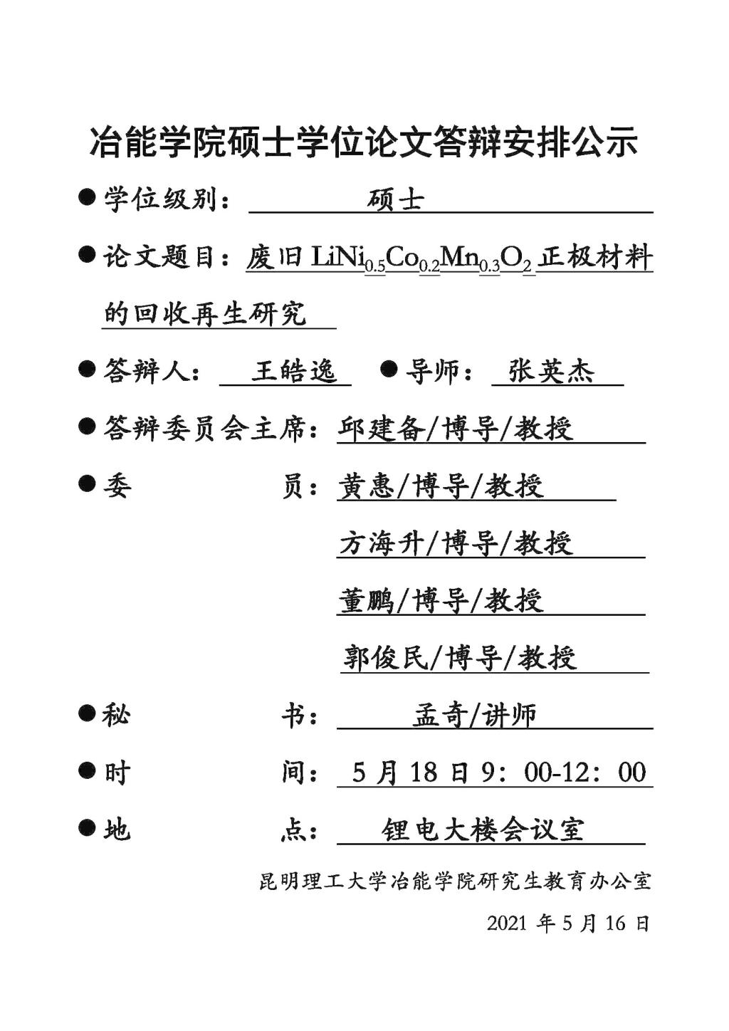 澳门娱乐城 硕士学位论文公开答辩安排公示——王皓逸,罗善雄,夏光辉,施晗程2021.5.18