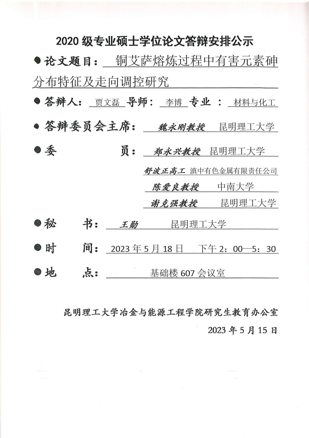 硕士学位论文答辩公示——陈德权,吉学武,贾文磊,冯智,惠舜尧,刘金月,李明洋——2023.05.18