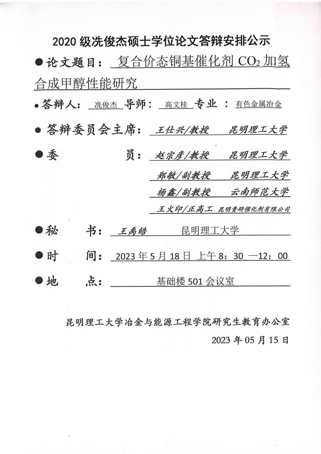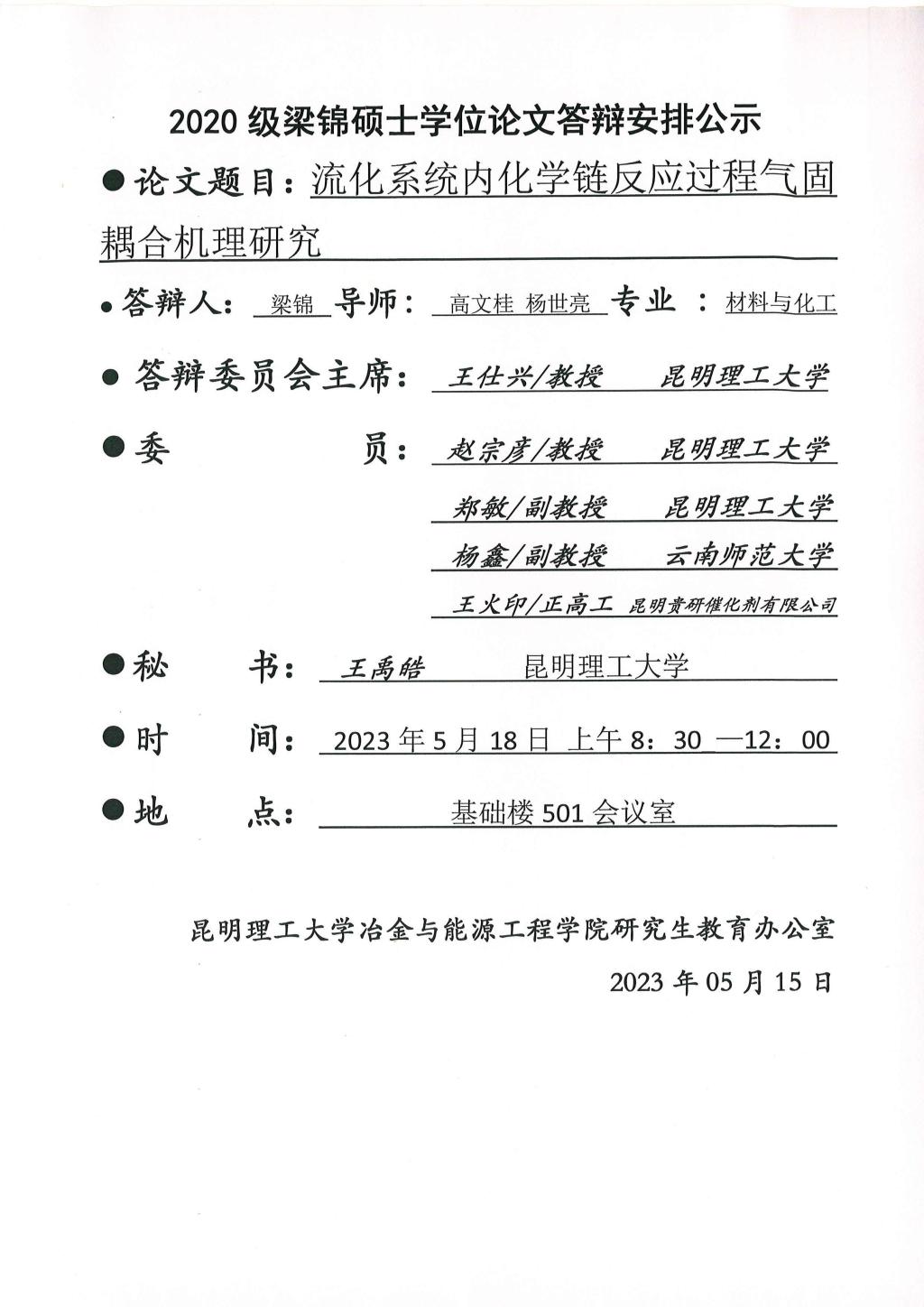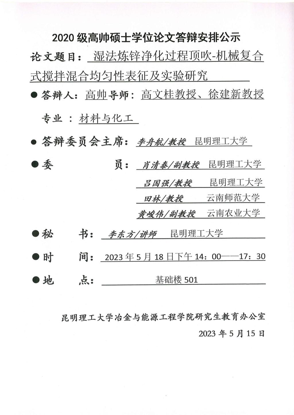 硕士学位论文答辩公示——高帅,张平尧,许云添,冼俊杰,梁锦,文蹇林——2023.05.18