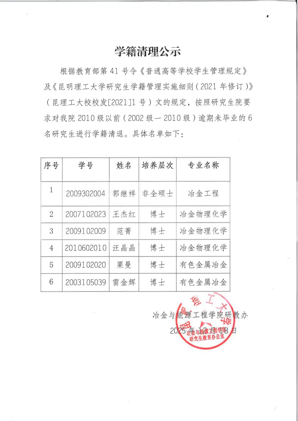 2025年12月澳门娱乐城 研究生学籍清理公示