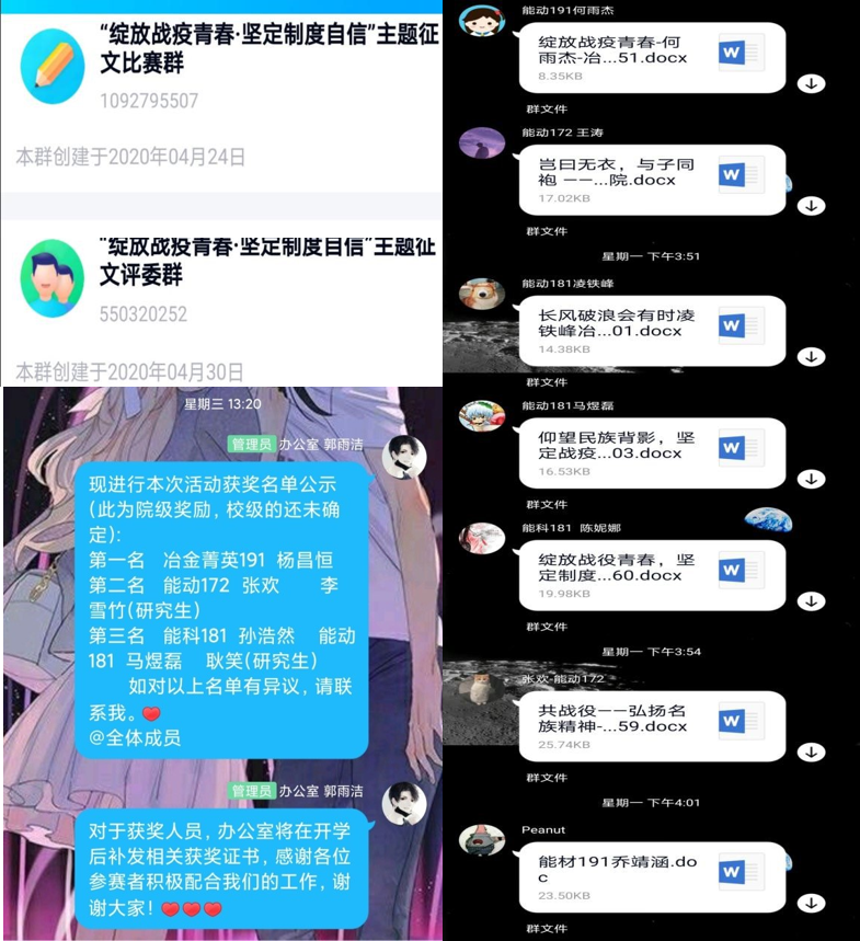 2020年4月底至5月初,为加强全院团员青年积极参与防控疫情的责任意识,增强战胜疫情的信心和决心,丰富同学们在疫情期间的文化生活,面向全院团员青年开展“绽放战疫青春·坚定制度自信”征文比赛。