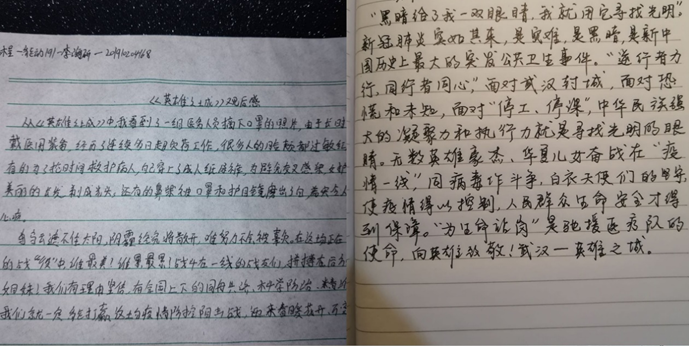 从纪录片中同学们了解到了这两个多月武汉发生了什么,他们过得怎么样;了解到有多少和我们一样的青年在为我们国家的强大默默付出。让同学们在前进的道路上找到了更加明确的方向,让我们学习这些抗“疫”战士,为祖国的繁荣昌盛添砖加瓦。
