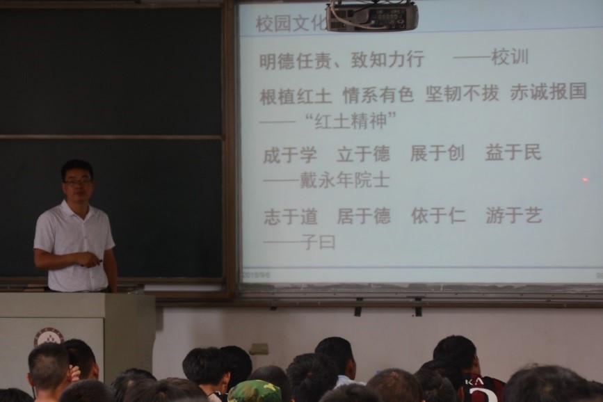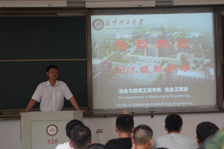 冶金学科做出巨大贡献的戴永年院士、李梦庚教授等多位奠基人,希望18级的新生能够将他们对冶金学科的精神传承下来,以他们为榜样树立严谨的科学态度。最后李老师着重介绍了节能减排大赛、科技创新大赛等大型学科竞赛,鼓励广大新生在本科阶段积极加入学院各个老师的课题小组和国家级、省部级实验研究平台。黄帮福老师从专业简介、培养计划、毕业方向等方面细致的向新生们介绍了他们即将面对的四年大学生活。黄老师说:“无论你是普通班,还是箐英班,都要好好学习,成绩好才是真实力。”并且强调要学好“物理化学”、“普通冶金流程”等几门重要的专业课程。在讲到毕业方向时黄老师将自己整理的往年毕业生去向统计数据展示给大家,告诫大家无论是选择升学还是就业,都应该提前做好准备,机会只会留给有准备的人。