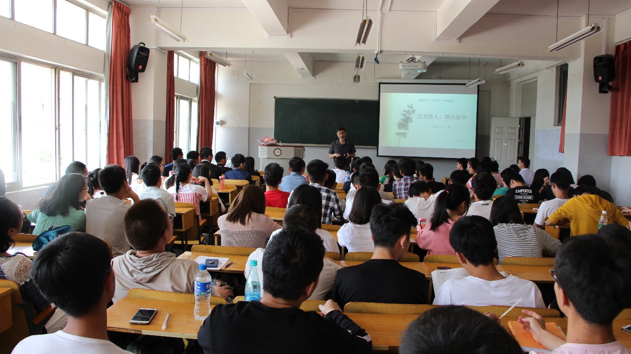 讲座开始,王煜老师从自己的中学求学时光开始讲起,以幽默风趣的语言向大家讲述了自己过去的经历,期间还穿插了自己游历二十几个国家丰富见识,期间教室里欢声笑语不断。王煜老师的讲座主要从五个方面出发,一、要立志,要立鸿鹄之志,强调立志和人生轨迹的关系;二、任何时候都不能放弃希望,通过对校友的经历出发,鼓励大家要有永不放弃的精神;三、本分做人,踏实做事,解释本分指的是把本职工作,分内的事做好,而本分的核心是“诚信”,提出了“只有你的言行举止不规范时才会被歧视,而不会因为的附属价值被歧视”;四、要有团队合作精神,提醒大家要有协调能力,也要有自己的一技之长;五、淡泊名利,宁静致远,建议大家保持良好积极地心态去迎接困难,并且在克服困难的历程中,有坚持到底的精神。