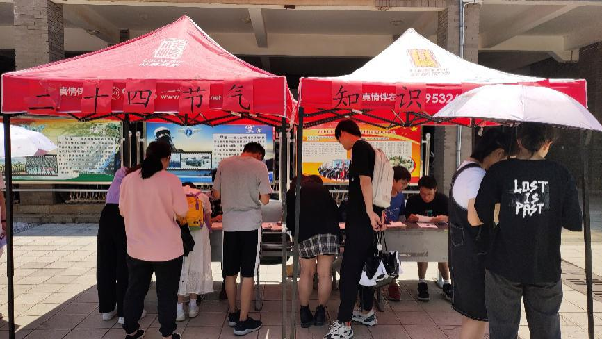 本次活动,工作人员为同学们准备了与二十四节气相关的知识和题目。在炎炎夏日下,同学们毫不在意,有的认认真真地做题,力求取得好成绩;有的在背诵二十四节气歌,气势丝毫不亚于做题的同学;而排队等候的同学则在查阅资料,为做题做准备,活动现场十分热闹,可见同学们对二十四节气相关知识的兴趣很高。此外,主办方还精心为获奖者挑选了礼物,予以鼓励。