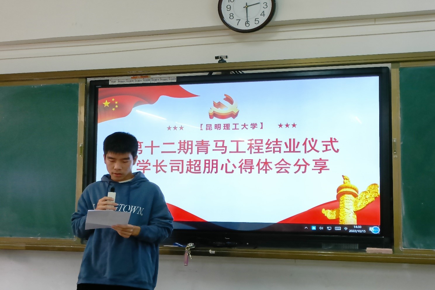 在主教学楼303室成功举办第十二期青马工程结业仪式,结业仪式以“时代召唤,青年担当”为主题, 第十二期青马工程学员参与。本次活动由组织部部长孙兆文主持。