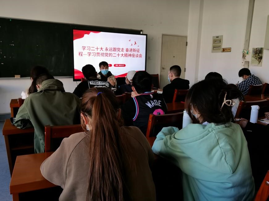 团委在管经楼104-2教室召开学习贯彻党的二十大精神座谈会。学院团委书记崔庆宇主持会议并领学党的二十大精神,辅导员裴宇婷和全体团学干部参加会议。