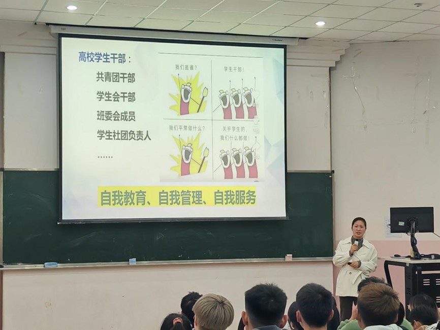 此外,令狐老师通过分享多个优秀学生干部的工作事例和以往校园文化活动的开展情况,实施朋辈教育,让同学们明白“奋斗”的意义,鼓励同学们明确目标,不负韶华,争做政治坚定、思想上进、业务过硬的学生干部。最后,讲座在热烈气氛中结束,同学们都深感受益匪浅。