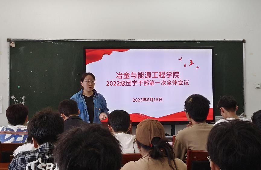 在管经楼102教室召开2022-2023学年第二学期第三次团学干部会议。本次会议由团委书记崔庆宇主讲,2022级全体团学干部参与。