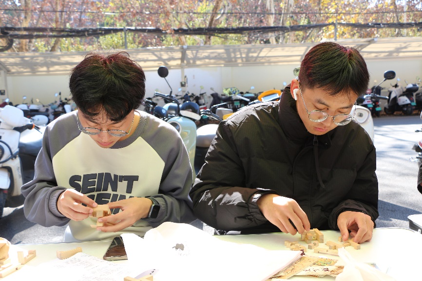 在本次活动中,参与的同学可以在形态各异的鲁班锁中挑选一个进行破解。活动现场气氛热烈,有的同学全神贯注,紧盯着手中的鲁班锁,反复琢磨,沉浸在自己的思考世界里,不断尝试,努力寻找打开鲁班锁的关键一步。也有的同学相互协作,相互交流讨论,分享着各自的见解与思路,在相互合作中体会思想碰撞的快乐,活动现场也不时传出阵阵恍然大悟后的惊叹声。随着活动的推进,越来越多的同学成功解锁鲁班锁,同学们纷纷表示,此次活动让他们对传统文化有更深的理解与认识,体会到了鲁班锁精巧结构中的卓越智慧和非凡技艺,也激发了他们对传统榫卯结构的浓厚兴趣。