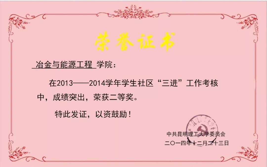 昆明理工大学2013-2014学年学生社区“三进”工作考评“二等奖”
