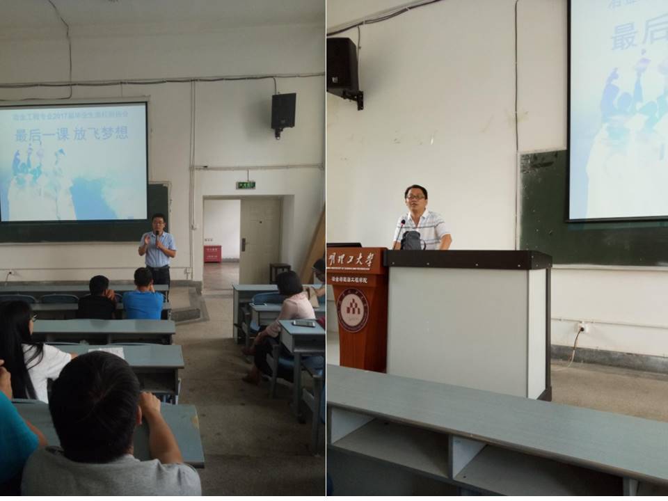 6月10日-13日,在各班毕业聚餐前,毕业班辅导员于志强老师分班组织召开了冶金工程专业2017届毕业生“最后一课放飞梦想”离校前主题班会。冶金系主任李兴彬,副主任俞小花、黄帮福,冶金毕业班专业导师朱云、陈雯、胡途、李艳、邓志敢、李博、周蕾等七位老师应邀分别参加了班会。主题班会由于志强老师主持。