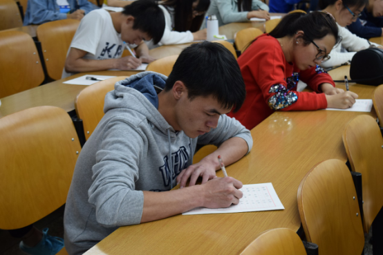 比赛分为初赛、复赛、决赛和排位赛,排位赛依靠积分排成绩,最终由选手们角逐出前三名。比赛开始,首先由主持人宣读比赛规则,工作人员给选手分发纸笔,主持人宣读二十个词语,每个词语读两遍,再由工作人员将词语的拼音注释写到黑板上,主持人解释词语的含义及出处,选手有十秒钟的作答时间,每写对一个词语加五分。经过第一轮的角逐,就有不少选手败下阵来,有人感叹汉字的博大精深,也有人悲叹自己的提笔忘字。活动中间还给大家看了一个关于象形文字的小故事,让选手们更加的了解中华汉字的来源与魅力。最终经过四轮的角逐,由陈源同学获得了本次比赛的第一名。