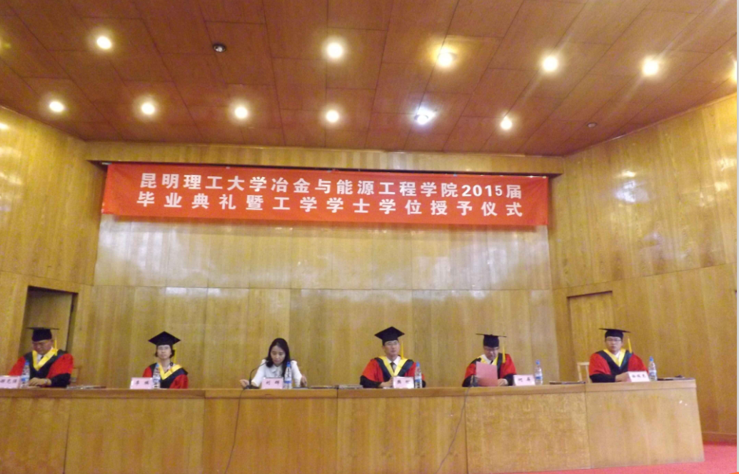 2015届毕业生毕业典礼暨工学学士学位授予仪式在莲华校区图书馆二楼报告厅举行。学院党委书记樊刚教授、党委副书记刘辉老师、副院长何屏教授、副院长徐瑞东教授、副院长李瑛副教授、冶金系主任谢克强教授出席了毕业典礼,并为获得工学学士学位同学授予学位。学院党委副书记刘辉老师主持典礼暨仪式。