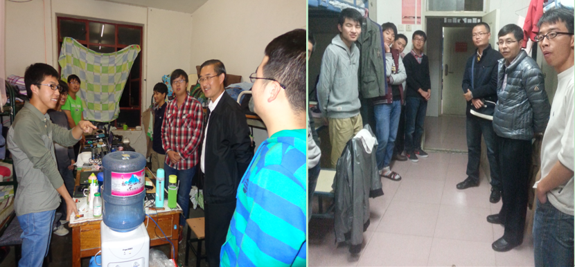 10月16日至11月5日, 学院党委书记樊刚教授、院长马文会教授、院党委副书记刘辉老师、副院长何屏教授、副院长李瑛副教授、副院长徐瑞东教授在辅导员老师的陪同下,走访了学院莲华校区学生宿舍,亲切慰问2011、2012级同学,传递了对同学们的关怀之情。学院领导的到来让同学们倍感荣幸,在走访过程中学院领导亲切地和同学们拉起家常,询问同学们学习、生活等方面的情况。领导们还认真地询问了2012级同学搬迁到莲华后的情况,对于2011级毕业生比较关心的就业、考研等问题做了仔细解答。