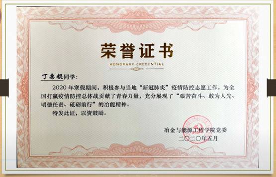 学院共产党员、共青团员青年,踊跃报名请战各类疫情防控志愿服务工作。有的穿梭在楼宇村道,宣传摸排;有的坚守在早出晚归门岗村口,测温劝返;有的辗转于超市菜场,购物送菜;有的捐款捐物奉献爱心等等,与全国奋战在疫情一线的其他人一道,成为了这个冬天最美的“逆行者”,用实际行动诠释了为人民服务的宗旨和“奉献、友爱、互助、进步”的志愿精神,彰显了新时代党(团)员大学生的责任与担当,树立了当代青年良好形象,为遏制疫情蔓延做出了积极的贡献!志愿者代表冶金171班魏凯京、能动181班李朱钰、冶金191班胡议友作了交流发言,他们表示,能立足身边,尽己所能,为国家出一份力,是新时代大学生的责任和义务。通过抗疫志愿工作,更加体会到国家的制度优势、人民的集体智慧与向心力,极大地增强了青年人的爱国主义精神。会上,通过播放视频的形式,回顾了志愿者们的工作情况和志愿感悟,并通过电子形式,一一向同学们颁发了荣誉证书。最后,令狐副书记传达了学院对同学们的关心和思念,回应了学生关切,并深情寄语毕业班的同学,在今后的人生道路上,要时刻谨记国家责任、青年担当;在校的非毕业班同学,要继续发扬艰苦奋斗、敢为人先的精神品质;希望全体同学,要用聪慧的、实干的、担当的姿态,播下一颗颗敢于拼搏、勇于奋进、勤于创新的种子,迎着绚丽的精彩人生,在时代年轮上刻下青春印记!
