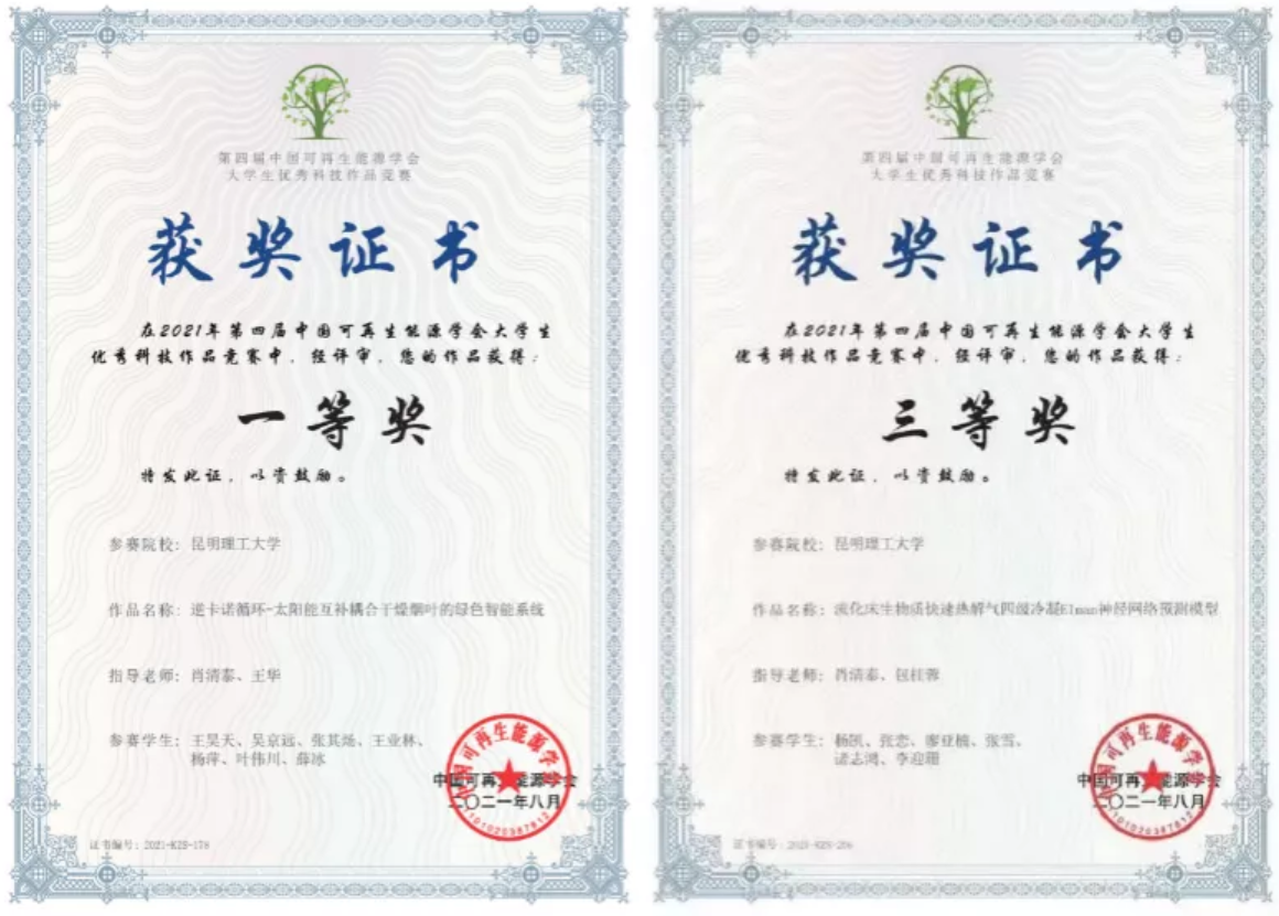 能动系教师指导的学生作品《逆卡诺循环-太阳能互补耦合干燥烟叶的绿色智能系统》(参赛学生:王昊天、吴京远、张其炀、王业林、杨萍、叶伟川、薛冰;指导教师:肖清泰、王华)荣获赛道一科技作品竞赛——研究生组(太阳能)一等奖,作品《流化床生物质快速热解气四级冷凝Elman神经网络预测模型》(参赛学生:杨凯、张恋、廖亚楠、张雪、诸志鸿、李迎珊;指导教师:肖清泰、包桂蓉)荣获赛道一科技作品竞赛——研究生组(生物质)三等奖。