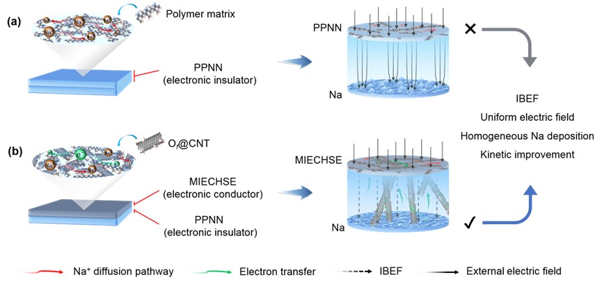 图2. 固态电解质界面电场及功能示意图:(a)复合固体电解质(PPNN)||Na界面,(b)离子-电子混合导电层固体电解质(MIECHSE)||Na界面。