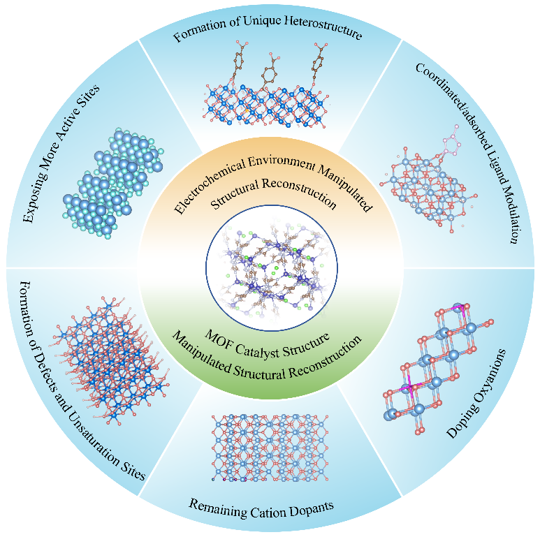 金属有机框架(MOFs)材料凭借高催化效率、可调谐纳米结构、暴露的金属活性位点等优势,在OER催化领域展现出巨大潜力。研究发现,MOF在电化学环境中的动态重构过程受多种因素调控,其结构演变与催化活性之间的构效关系尚未明确,这极大地阻碍了高性能MOF基催化剂的定向设计。针对这一关键科学问题,胡觉教授在综述中系统梳理了MOF基OER电催化剂动态重构领域的最新研究进展,首次从“电化学环境调控”与“MOF结构调控”双维度,深入剖析了触发MOF重构的核心因素,前者包括电解质、电压、反应中间体、温度压力等外部条件,后者涵盖MOF的形貌、组成元素、金属中心配位环境、电子结构等内在属性,明确了多因素协同作用下MOF的重构路径及其演化规律。该综述的发表不仅为MOF电催化剂动态重构研究提供了全面的学术参考,也为将继续围绕MOF材料的结构设计、重构调控与性能优化开展研究,助力新能源催化技术实现突破。
