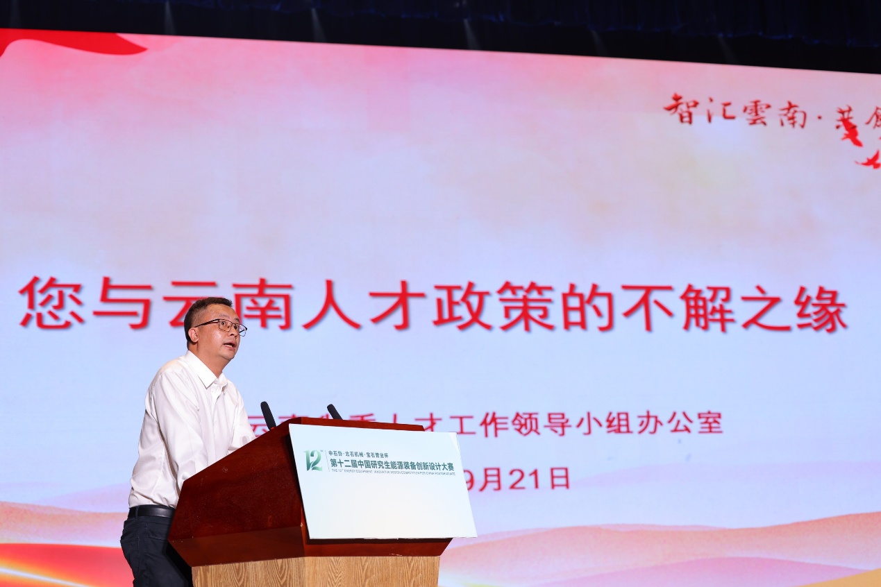 昆明理工大学党委书记唐家华在致辞中,向教育部、中国学位与研究生教育学会、中国石油和石油化工设备工业协会等指导和主办单位,以及参赛师生和专家评委表示衷心感谢。他指出,本届大赛共汇聚9875名青年才俊,展示2435件优秀作品,创下历届新高。从海洋能源开发、低碳冶金,到智能水电、生物质转化,九大赛题全面体现了能源装备领域的最新探索。尤为突出的是企业“揭榜挂帅”机制,真正实现“企业出题、能者解题”,推动科研力量直面产业一线问题。他强调,昆明理工大学作为承办方,将继续坚持心怀“国之大者”,积极服务国家能源安全与低碳发展,培养拔尖创新人才,推动产学研深度融合。同时,他寄语青年学子要牢记“国之所需,吾之所向”,怀爱国之心、立报国之志、增强国之能,把个人理想融入国家发展大局,为建设教育强国、科技强国、人才强国贡献青春力量。